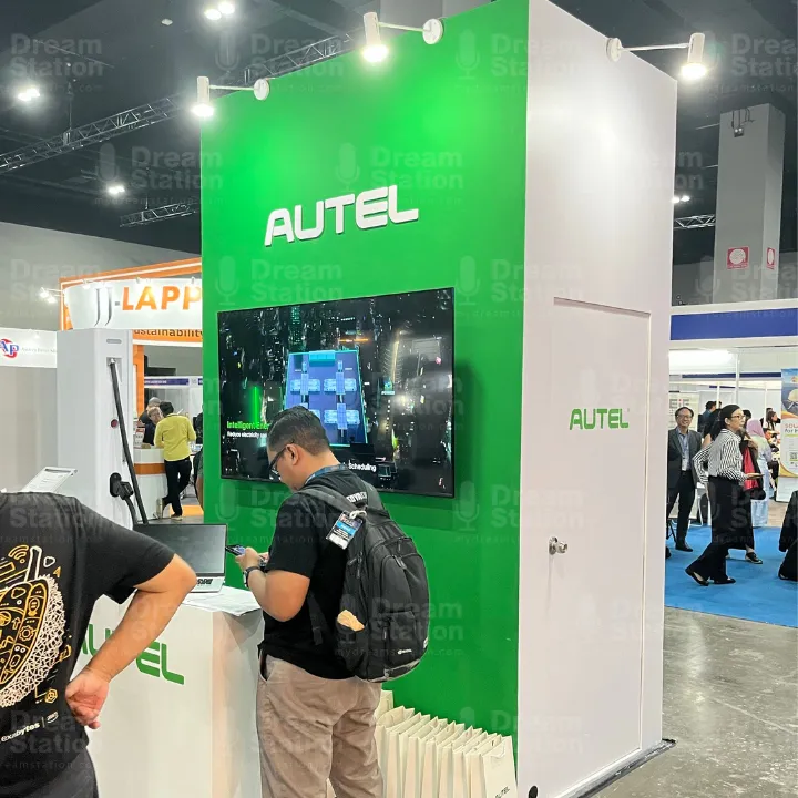 The booth featured tailored wooden structures, logo die-cut signage, TV display integrations, and functional furniture, creating a polished environment that balanced brand visibility with visitor engagement. By overseeing logistics, technical execution, and space planning, Dream Station ensured Autel’s presence stood out at one of Malaysia’s leading clean energy exhibitions.